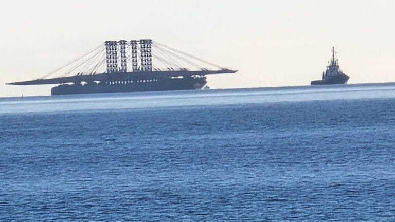 Der außergewöhnliche maritime Konvoi mit dem Brückendeck für die Pont Anne-de-Bretagne hat eine unerwartete Ankerpause eingelegt. Seit gestern, dem 16. November, befindet sich der Schleppzug in stationärer Position vor der Küste der Gemeinde Manilva an der westlichen Costa del Sol.